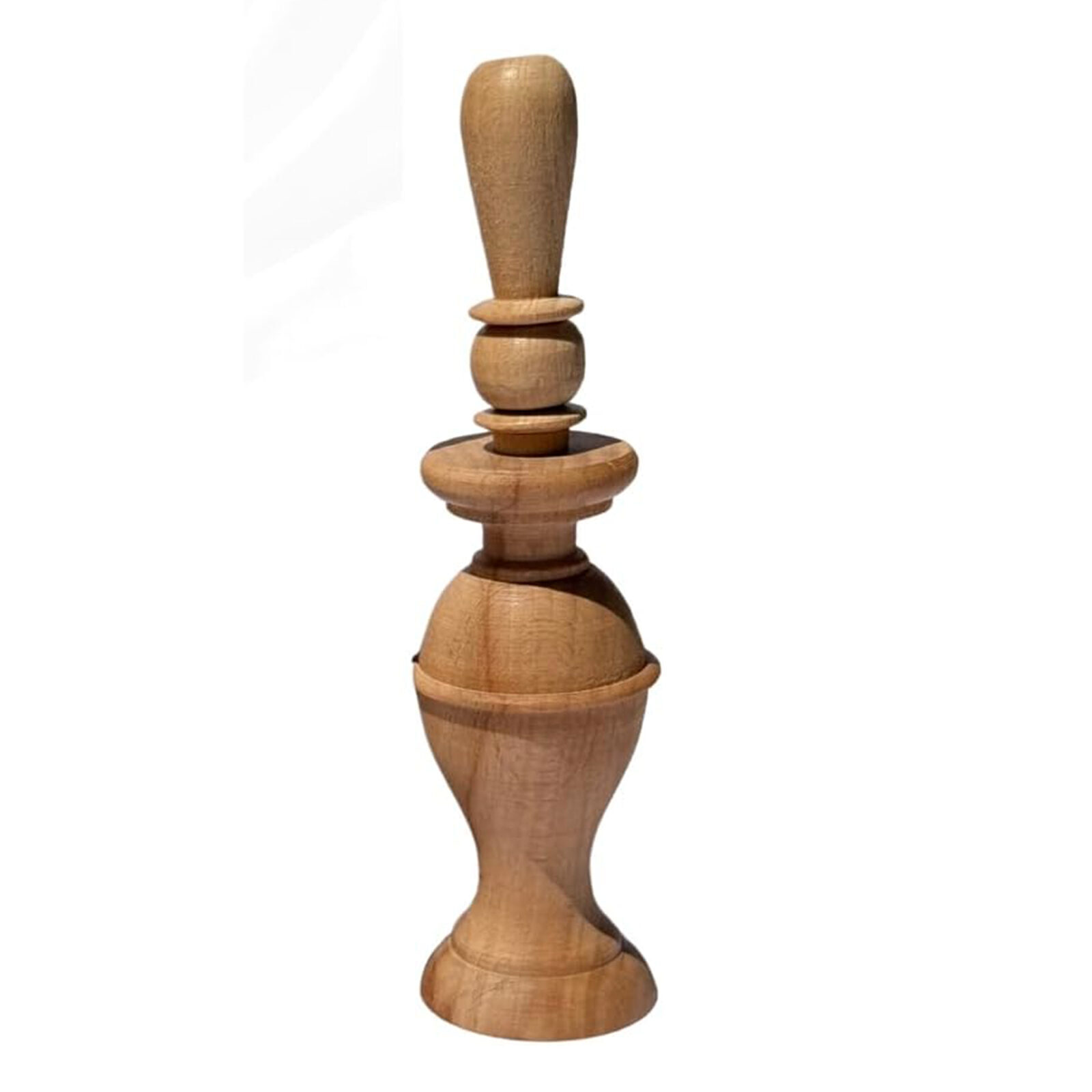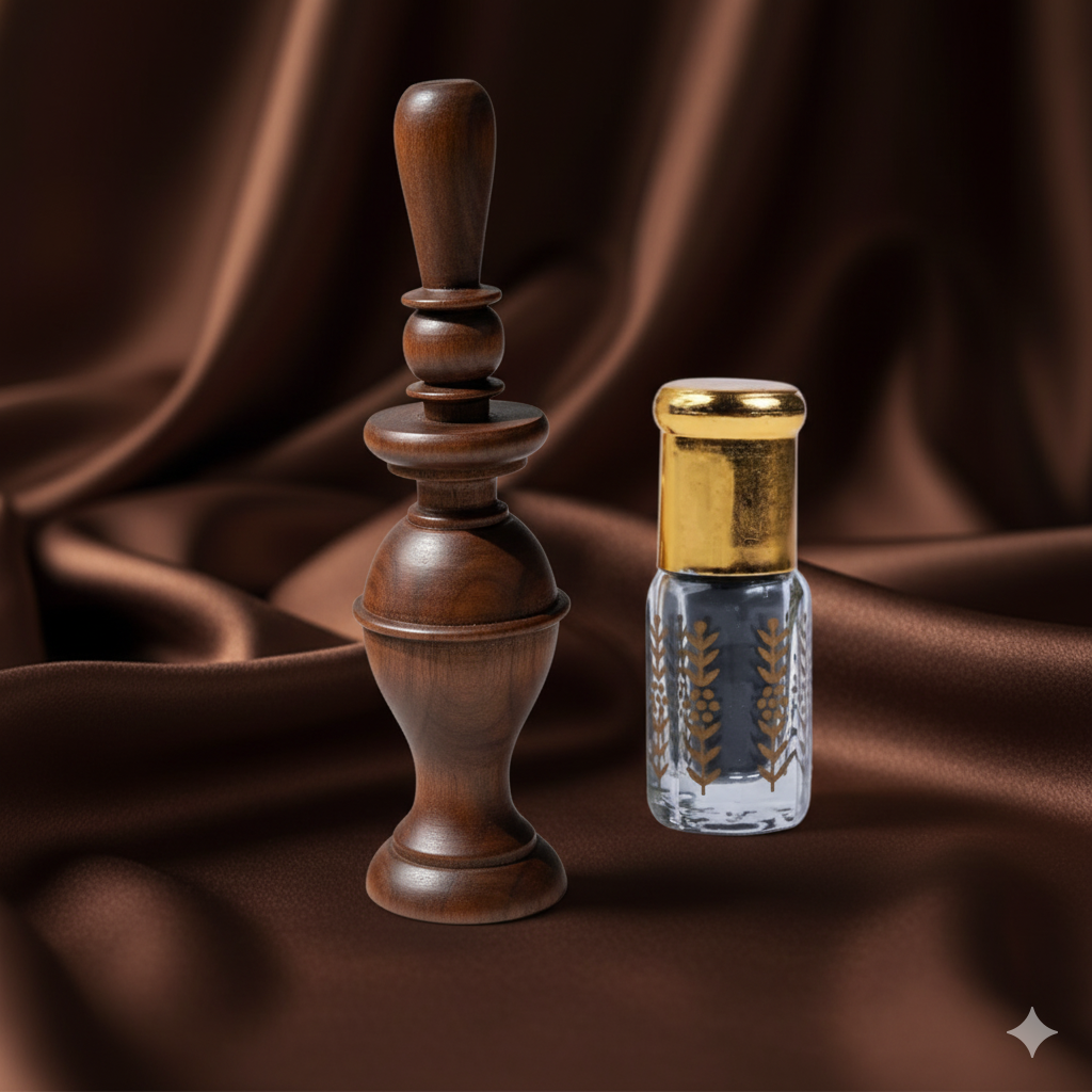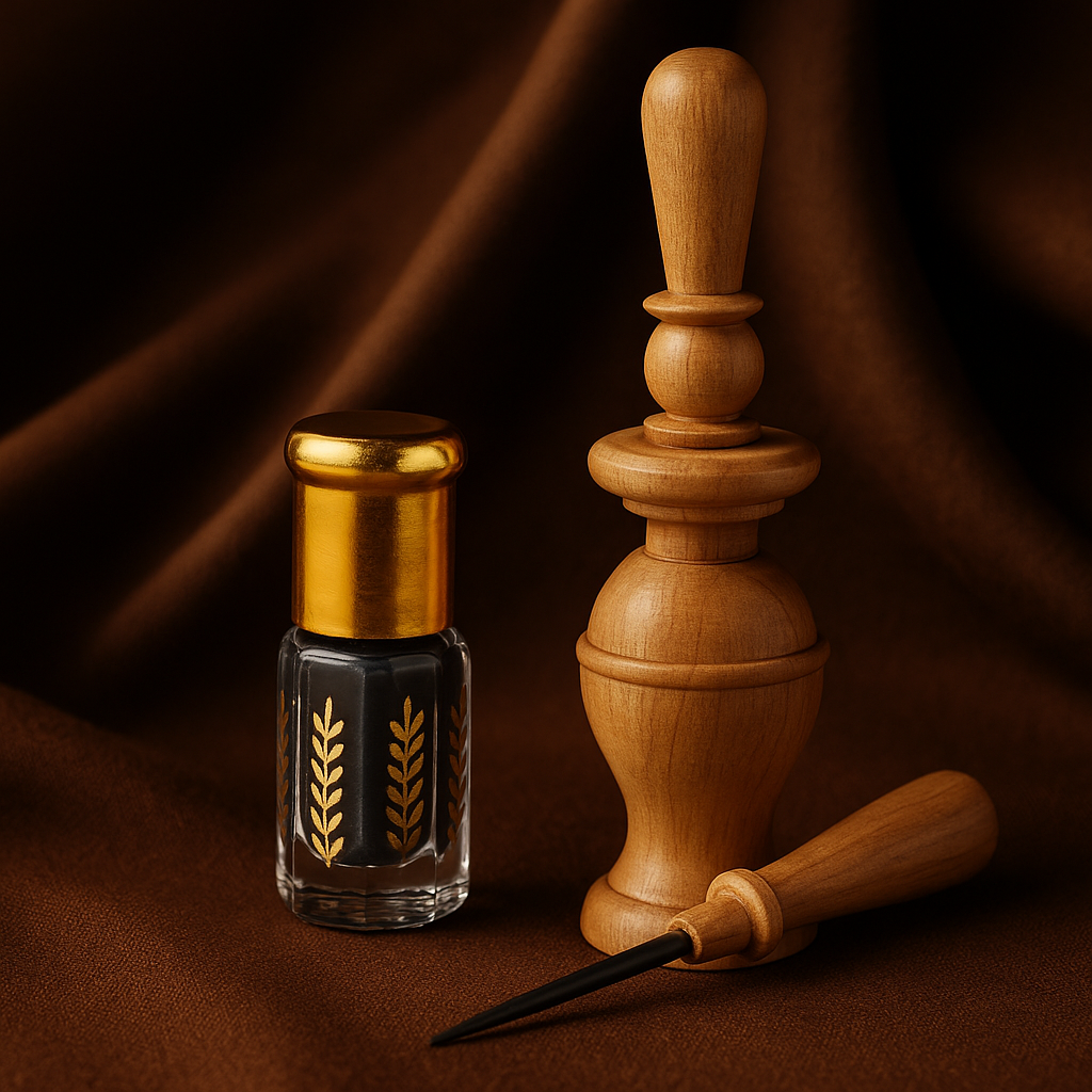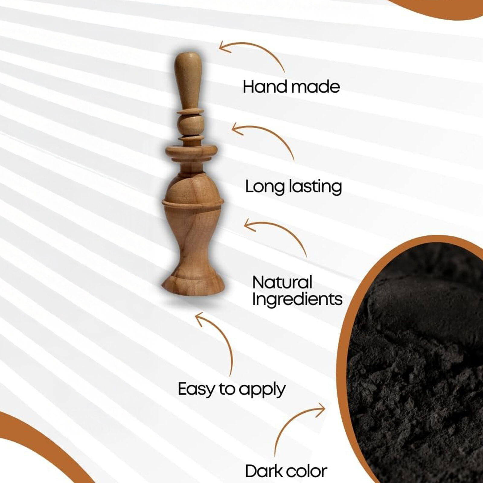 تأتي العبوة في زجاجة صغيرة أنيقة مزينة بنقوش ذهبية عربية، مصحوبة بمكحلة خشبية فاخرة مصنوعة يدويًا بدقة عالية. تصميمها العملي يجعل عملية وضع الكحل سهلة ومريحة مع لمسة تراثية راقية.