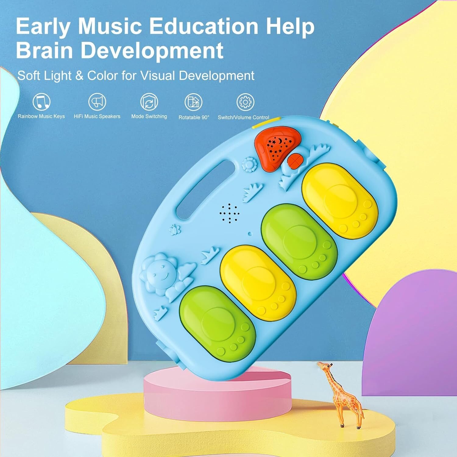أهم ميزة إنها مزودة ببيانو بيشتغل باللمس والركل، حيث الألحان والأصوات الممتعة بتساعد على تنمية السمع والتركيز من بدري.