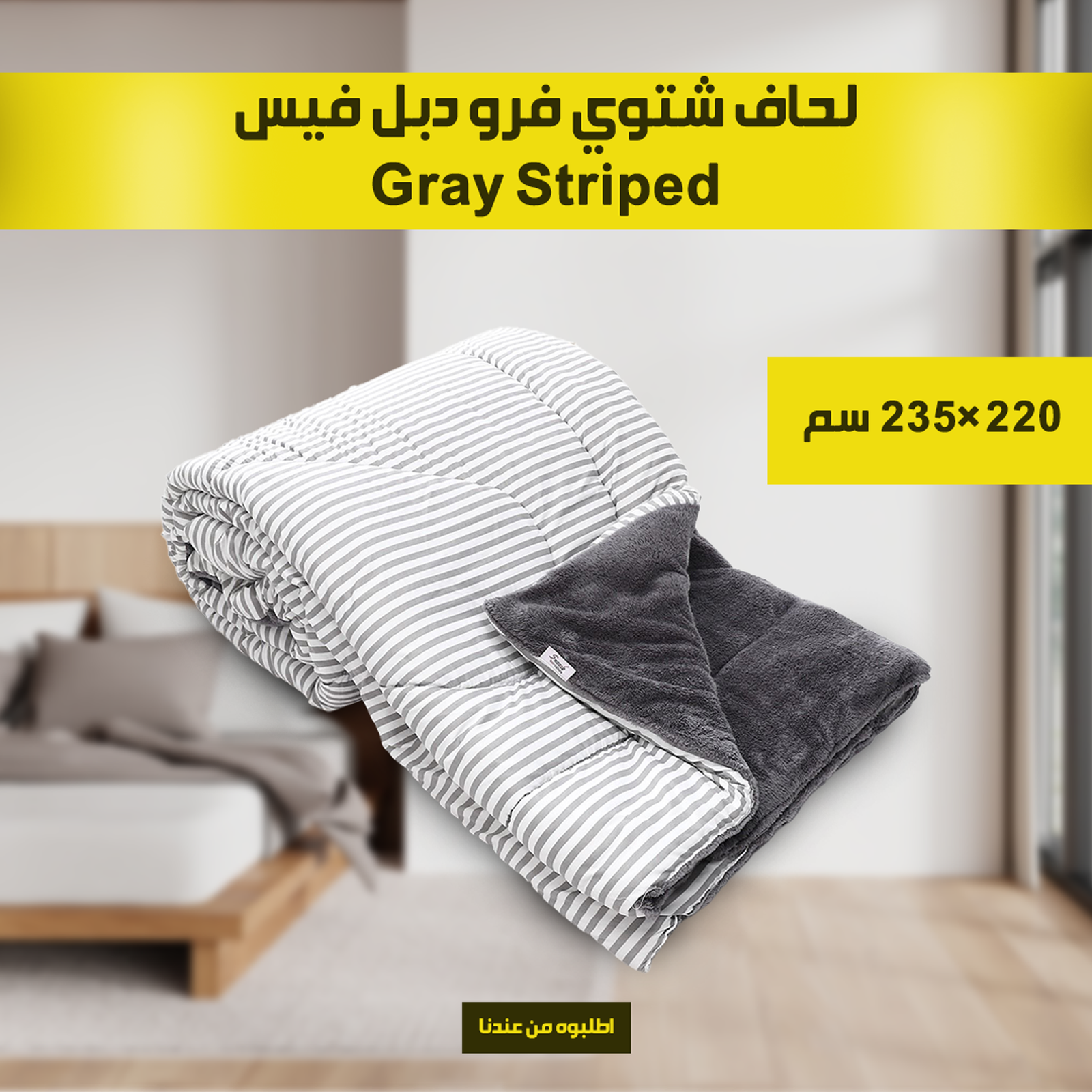 – “دلوقتي مع اللحاف الشتوي الفرو دبل فيس Gray Striped ، هتنام في دفا وراحة فاخرة طول الشتاء حجمه الكبير 220*235cm هيغطي سريرك بأناقة ودفء