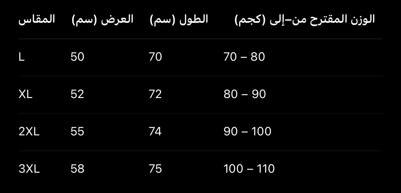 - مقاس 3XL: مناسب لوزن من 100 إلى 110 كجم.